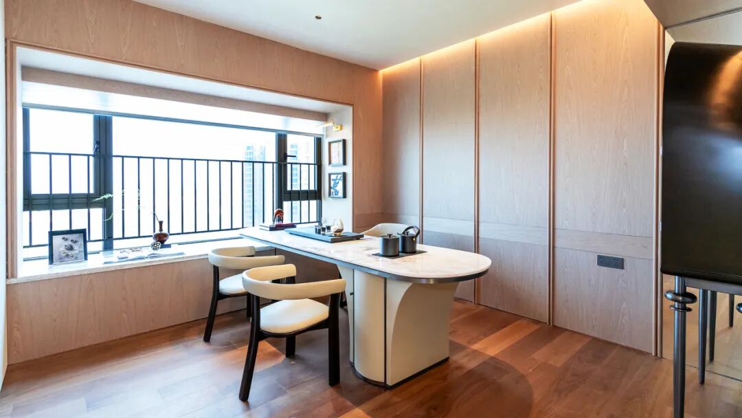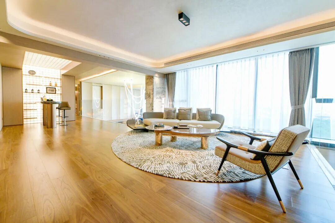 约6m中空挑高的阔绰会客厅,约7.3m的全面屏玻璃幕墙,奢享270º南向一线观湖视野;超大空间尺度,进可拥享天伦,退可商务会谈,谈笑间自成大家风范,尽显豪迈格局。