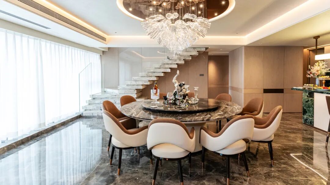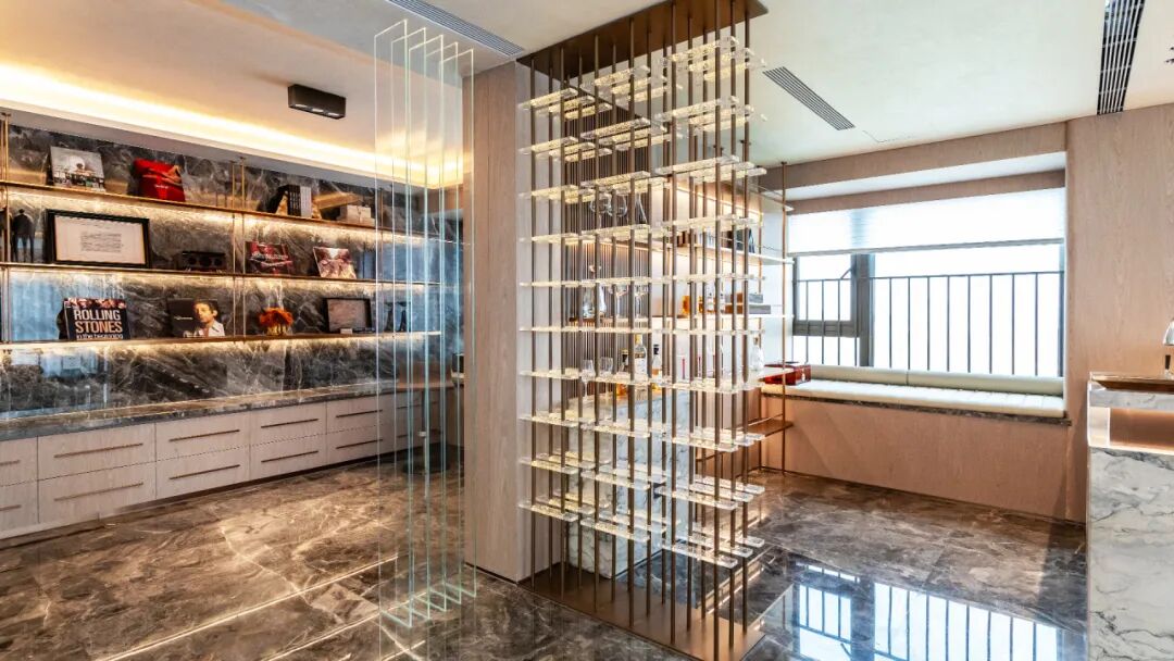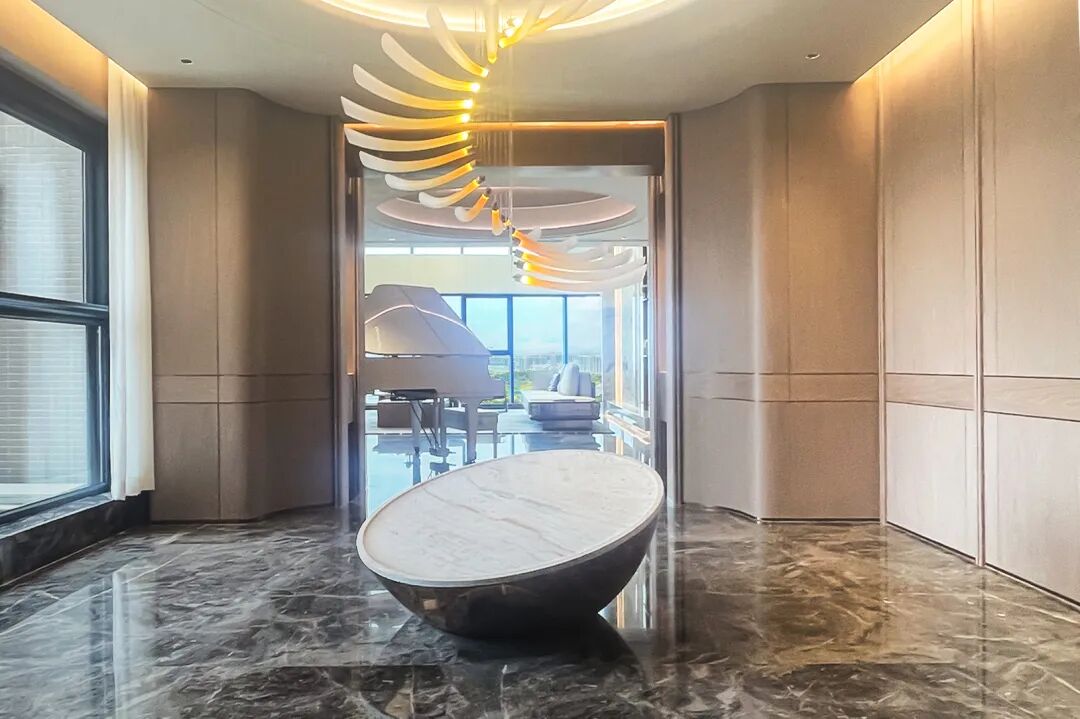 建面约410㎡全景顶复户型首层,一进门即是媲美五星级酒店大堂的独立高阔门厅,透过精致华丽的艺术灯饰,直瞰绝美湖幕景色,“出入皆礼遇”的归家仪式感扑面而来。