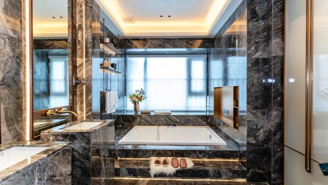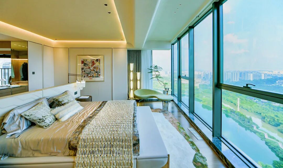 面积约50㎡的定制级全能主卧套房,自带独立衣帽区、独立卫浴间(步入式温泉泡池+桑拿房),拥有更强的居住舒适感;全玻璃幕墙观湖视野,领驭独立奢适生活空间。